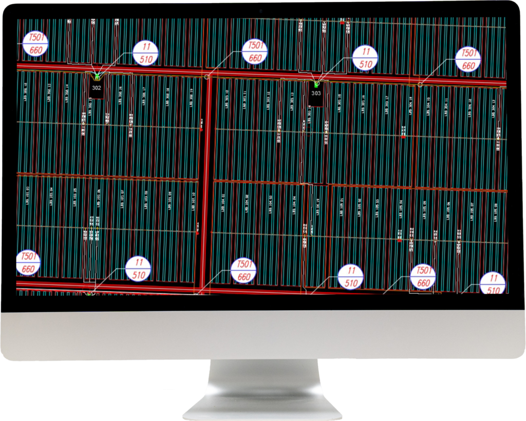 Solar systems, like wind farms, need to optimize their collector systems. Many variables go into creating the best design such as geographic constraints, including terrain, road crossings, and property rights, as well as the numerous factors that impact engineering performance. The screenshot above shows a solar farm that was laid out using AUD. The geographic constraints in the background map and the configured validation rules for generator racking and combiner names are visible, helping with that optimization in design.