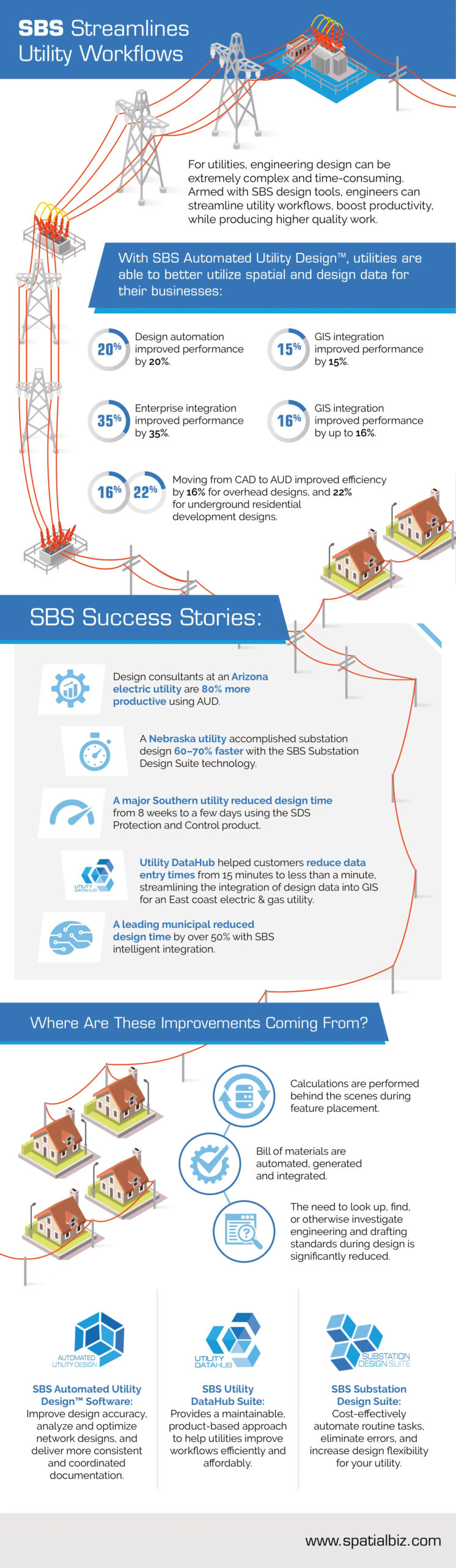 Armed with Spatial Business Systems design tools, engineers can streamline utility workflows, boost productivity, and even produce higher quality work. With the SBS engineering design suite, utilities were able to better utilize spatial and design data for their businesses.